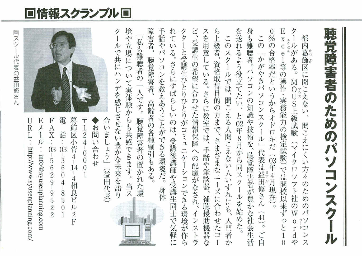 転載許可 2003.5.28 いくお〜る編集部小川さま確認済み 都内葛飾区に聞こえない、聞こえにくい方々のためのパソコンスクールがある。MOUS上級試験(マイクロソフト社のWordやExcel等の操作。実務能力検定試験)では開校以来ずっと100%の合格率だというからオドロキだ(03年4月現在)。 この「かがやきパソコンスクール」代表は益田修さん(41)。ご自身も難聴者。パソコンの知識や技術を、聴覚障害者が豊かな社会生活を送れるよう役立てたい、と02年8月から同スクールを始めた。 このスクールでは、聞こえる人聞こえない人いずれにも、入門者から上級者、資格取得目的の方まで、さまざまなニーズに合わせたコースを用意している、さらに教室では、手話や筆談気、補聴援助機器など、受講生の希望に合わせた情報保障への配慮がなされ、インストラクターと受講生ひとりひとりがコミュニケーションできる環境が作られている。さらにすばらしいのは、受講後講師や受講生同士で気軽に手話やパソコンを教えあうことができる環境だ。身体障害者、聴覚障害者、高齢者の各種割引もある。 「私も難聴者の一人です。聴覚障害者の置かれた環境や立場について実体験からも共感できます。当スクールで共にハンデを感じさせない豊かな未来を語り合いましょう」(益田代表) ◆お問い合わせ 郵便124-0001 葛飾区小菅4−14−4相良ビル2F 電話 03-3604-8501 FAX 03-5629-9522 URL http://www.syusenplanning.com/