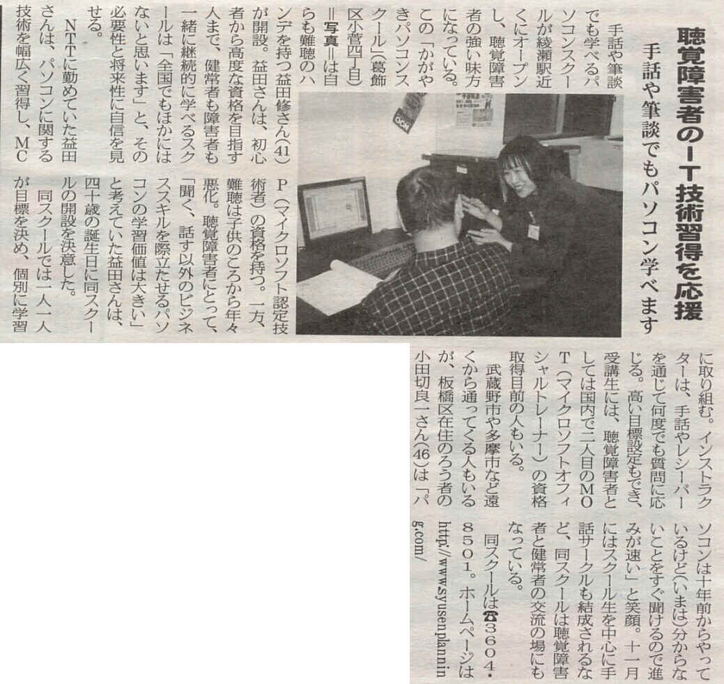 手話や筆談でもパソコン学べます 手話や筆談でも学べるパソコンスクールが綾瀬駅近くにオープンし、聴覚障害者の強い味方になっている。この「かがやきパソコンスクール」(葛飾区小菅四丁目)=写真=は自らも難聴のハンデを持つ益田修さん(41)が開設。益田さんは、初心者から高度な資格を目指す人まで、健常者も障害者も一緒に継続的に学べるスクールは「全国でもほかにはないと思います」と、その必要性と将来性に自信を見せる。 NTTに勤めていた益田さんは、パソコンに関する技術を幅広く習得し、MCP(マイクロソフト認定技術者)の資格を持つ。一方、難聴は子供のころから年々悪化。聴覚障害者にとって、「聞く、話す以外のビジネススキルを際立たせるパソコンの学習価値は大きい」と考えていた益田さんは、四十歳の誕生日に同スクールの開設を決意した。 同スクールでは、一人一人が目標を決め、個別に学習に取り組む。インストラクターは、手話やレシーバーを通じて何度でも質問に応じる。高い目標設定もでき、受講生には、聴覚障害者としては国内で二人目のMOT(マイクロソフトオフィシャルトレーナー)の資格取得目前の人もいる。 武蔵野市や多摩市など遠くから通ってくる人もいるが、板橋区在住のろう者の小田切良一さん(46)は「パソコンは十年前からやっているけど(いまは)分からないことをすぐ聞けるので進みが速い」と笑顔。十一月にはスクール生を中心に手話サークルも結成されるなど、同スクールは聴覚障害者と健常者の交流の場にもなっている。 同スクールは、 3604・8501。ホームページはhttp://www.syusenplanning.com/